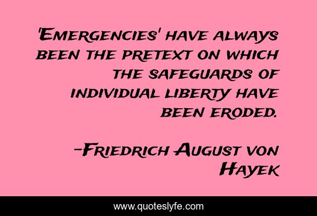 This page presents the quote "'Emergencies' have always been the pretext on which the safeguards of individual liberty have been eroded.". Author of this quote is Friedrich August von Hayek. This quote is about always, individual, liberty,.