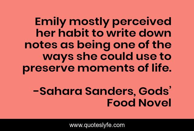 This page presents the quote "Emily mostly perceived her habit to write down notes as being one of the ways she could use to preserve moments of life.". Author of this quote is Sahara Sanders, Gods’ Food Novel. This quote is about moments, writers-on-writing, moments-of-life, authors-on-writing,.