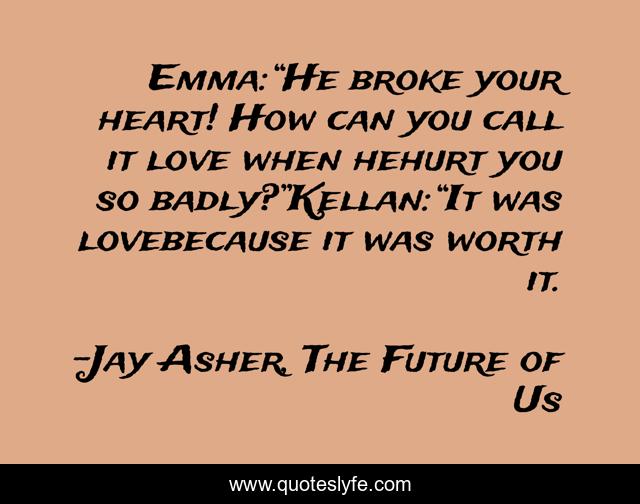 This page presents the quote "Emma:“He broke your heart! How can you call it love when hehurt you so badly?”Kellan:“It was lovebecause it was worth it.". Author of this quote is Jay Asher, The Future of Us. This quote is about life, love, awesome, opinion, true, affection,.