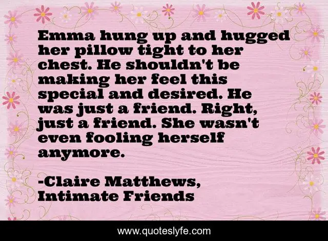 This page presents the quote "Emma hung up and hugged her pillow tight to her chest. He shouldn't be making her feel this special and desired. He was just a friend. Right, just a friend. She wasn't even fooling herself anymore.". Author of this quote is Claire Matthews, Intimate Friends. This quote is about friends, love, friendship, affection,.
