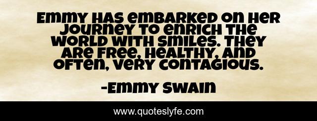 This page presents the quote "Emmy has embarked on her journey to enrich the world with smiles. They are free, healthy, and often, very contagious.". Author of this quote is Emmy Swain. This quote is about smile, life, love-each-other, happiness,.