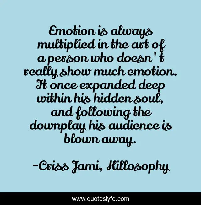 "Criss Jami, Killosophy Quotes." Quoteslyfe.com, 2025. Sat. 06 Dec. 2025. <https://www.quoteslyfe.com/quote/Emotion-is-always-multiplied-in-the-art-62718>.