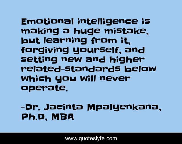 This page presents the quote "Emotional intelligence is making a huge mistake, but learning from it, forgiving yourself, and setting new and higher related-standards below which you will never operate.". Author of this quote is Dr. Jacinta Mpalyenkana, Ph.D, MBA. This quote is about life-lessons, standards-of-life, personal-standards,.