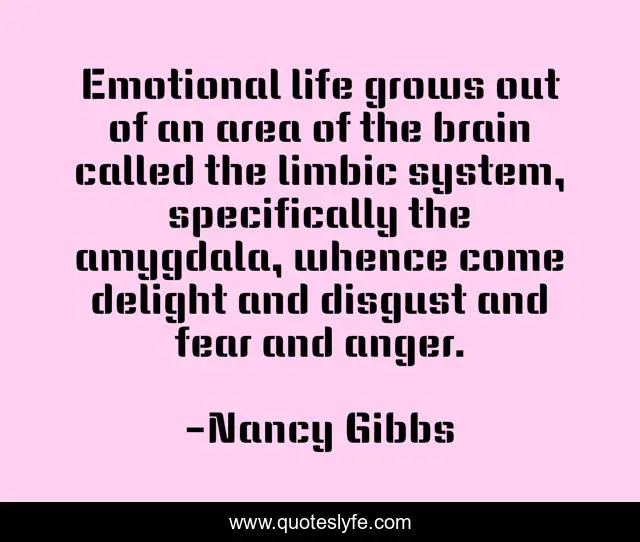 This page presents the quote "Emotional life grows out of an area of the brain called the limbic system, specifically the amygdala, whence come delight and disgust and fear and anger.". Author of this quote is Nancy Gibbs. This quote is about brain, life, fear,.