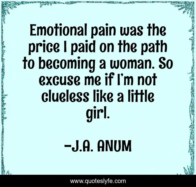 This page presents the quote "Emotional pain was the price I paid on the path to becoming a woman. So excuse me if I’m not clueless like a little girl.". Author of this quote is J.A. ANUM. This quote is about life, woman, pain, girls, poetry, quotes, popular, poems, emotional-pain,.
