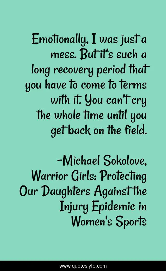 This page presents the quote "Emotionally, I was just a mess. But it’s such a long recovery period that you have to come to terms with it. You can’t cry the whole time until you get back on the field.". Author of this quote is Michael Sokolove, Warrior Girls: Protecting Our Daughters Against the Injury Epidemic in Women's Sports. This quote is about injury, sports,.