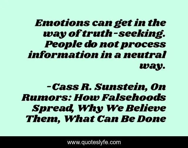 This page presents the quote "Emotions can get in the way of truth-seeking. People do not process information in a neutral way.". Author of this quote is Cass R. Sunstein, On Rumors: How Falsehoods Spread, Why We Believe Them, What Can Be Done. This quote is about emotion, rumors, truths, emotions, truth, rumor,.