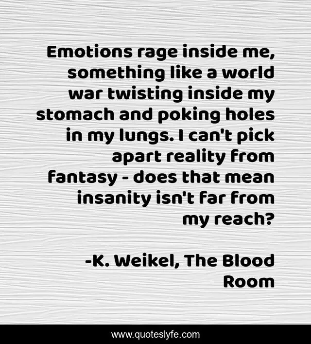 This page presents the quote "Emotions rage inside me, something like a world war twisting inside my stomach and poking holes in my lungs. I can't pick apart reality from fantasy - does that mean insanity isn't far from my reach?". Author of this quote is K. Weikel, The Blood Room. This quote is about emotion, insanity,.