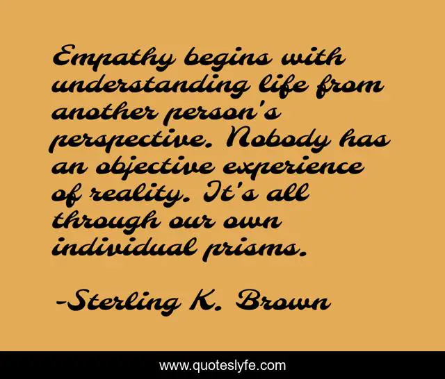 This page presents the quote "Empathy begins with understanding life from another person's perspective. Nobody has an objective experience of reality. It's all through our own individual prisms.". Author of this quote is Sterling K. Brown. This quote is about life, empathy, perspective,.