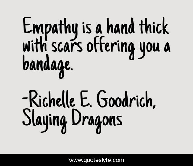 This page presents the quote "Empathy is a hand thick with scars offering you a bandage.". Author of this quote is Richelle E. Goodrich, Slaying Dragons. This quote is about empathy, compassion, richelle-e-goodrich, feeling-for-others, richelle, richelle-goodrich,.