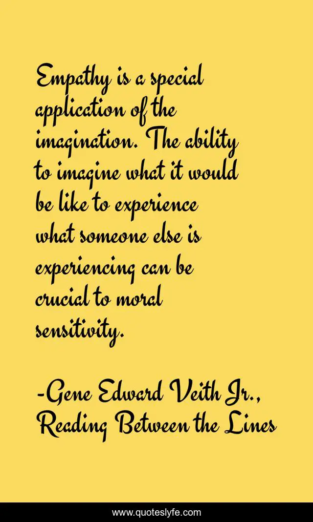 This page presents the quote "Empathy is a special application of the imagination. The ability to imagine what it would be like to experience what someone else is experiencing can be crucial to moral sensitivity.". Author of this quote is Gene Edward Veith Jr., Reading Between the Lines. This quote is about compassion, curiosity,.