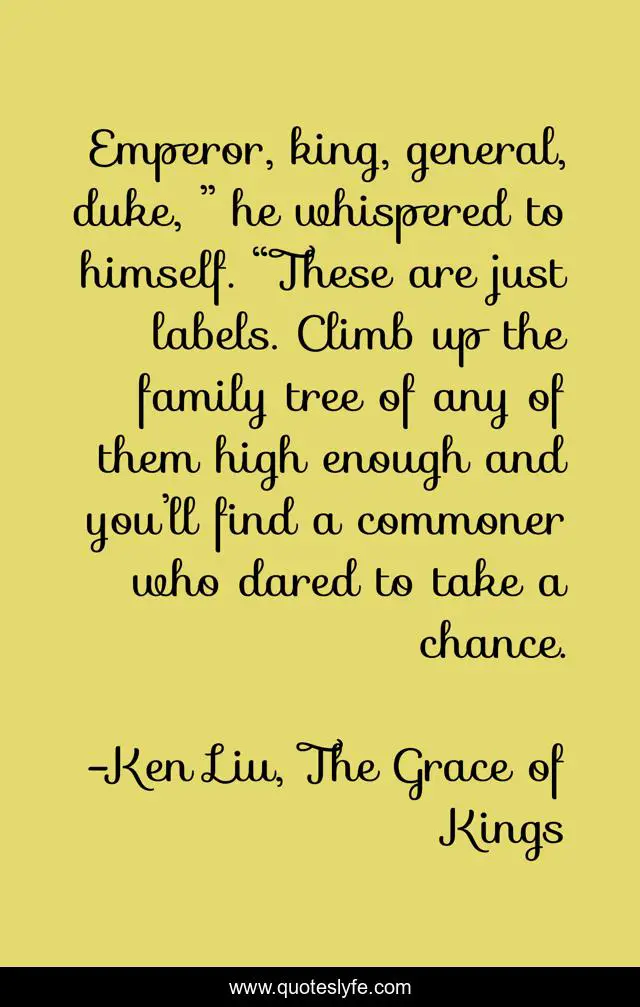 This page presents the quote "Emperor, king, general, duke, ” he whispered to himself. “These are just labels. Climb up the family tree of any of them high enough and you’ll find a commoner who dared to take a chance.". Author of this quote is Ken Liu, The Grace of Kings. This quote is about commoners, rags-to-riches, royalty, upliftment, ambition,.