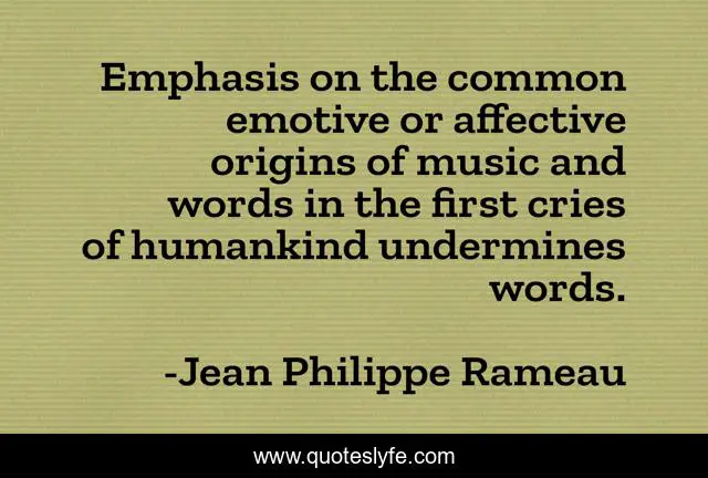 This page presents the quote "Emphasis on the common emotive or affective origins of music and words in the first cries of humankind undermines words.". Author of this quote is Jean Philippe Rameau. This quote is about common, words, first,.
