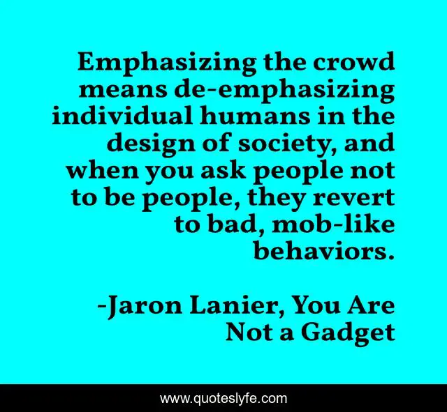 This page presents the quote "Emphasizing the crowd means de-emphasizing individual humans in the design of society, and when you ask people not to be people, they revert to bad, mob-like behaviors.". Author of this quote is Jaron Lanier, You Are Not a Gadget. This quote is about individuality, crowd, computers, internet, mob, technology,.