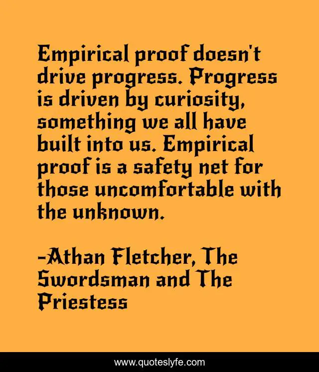 This page presents the quote "Empirical proof doesn't drive progress. Progress is driven by curiosity, something we all have built into us. Empirical proof is a safety net for those uncomfortable with the unknown.". Author of this quote is Athan Fletcher, The Swordsman and The Priestess. This quote is about progress, empirical, proof,.