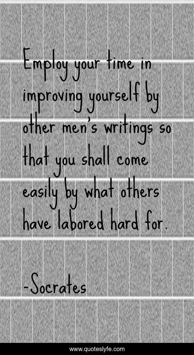 This page presents the quote "Employ your time in improving yourself by other men's writings so that you shall come easily by what others have labored hard for.". Author of this quote is Socrates. This quote is about enthusiasm, reading, inspirational, wisdom,.