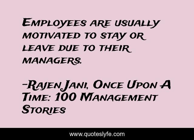 This page presents the quote "Employees are usually motivated to stay or leave due to their managers.". Author of this quote is Rajen Jani, Once Upon A Time: 100 Management Stories. This quote is about motivation, communication, sales, anger, improvement, quality, management, knowledge, strategy,.