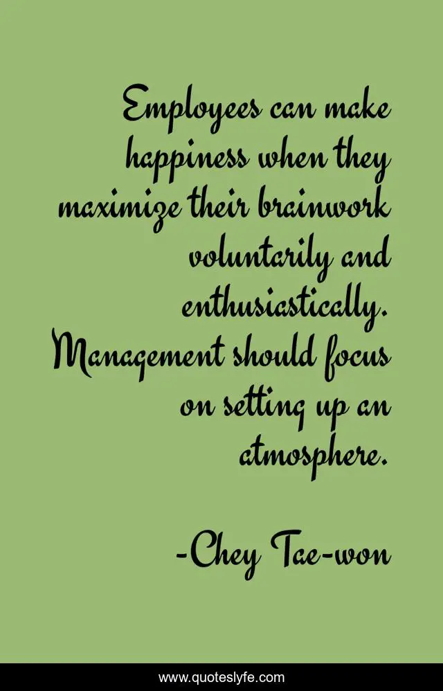 This page presents the quote "Employees can make happiness when they maximize their brainwork voluntarily and enthusiastically. Management should focus on setting up an atmosphere.". Author of this quote is Chey Tae-won. This quote is about employees, management, focus,.