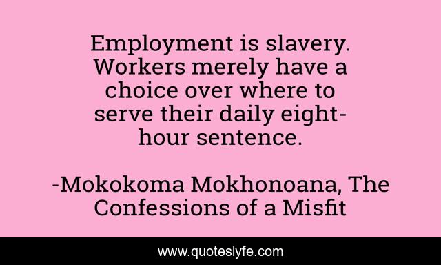 "Mokokoma Mokhonoana, The Confessions of a Misfit Quotes." Quoteslyfe.com, 2025. Mon. 08 Dec. 2025. <https://www.quoteslyfe.com/quote/Employment-is-slavery-Workers-merely-have-a-197872>.