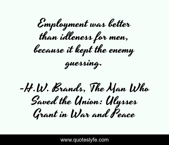 This page presents the quote "Employment was better than idleness for men, because it kept the enemy guessing.". Author of this quote is H.W. Brands, The Man Who Saved the Union: Ulysses Grant in War and Peace. This quote is about leadership, boredom, activity,.