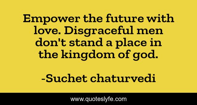 This page presents the quote "Empower the future with love. Disgraceful men don't stand a place in the kingdom of god.". Author of this quote is Suchet chaturvedi. This quote is about writers-inspiration, graceful-attitude, empowerment, wisdom-inspirational, love-yourself, lighten-the-burden-of-others, love-life, pleaure-of-the-journey, don-t-lose-hope,.