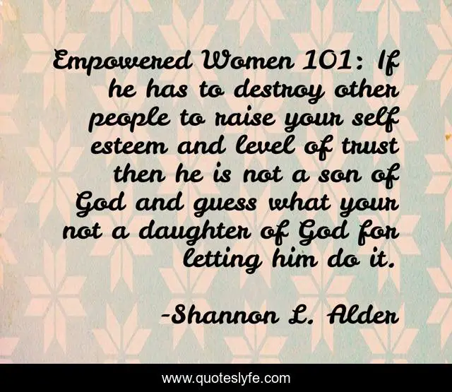 This page presents the quote "Empowered Women 101: If he has to destroy other people to raise your self esteem and level of trust then he is not a son of God and guess what your not a daughter of God for letting him do it.". Author of this quote is Shannon L. Alder. This quote is about control, doormat, empowering-women-101, stayingpositiveu-com,.