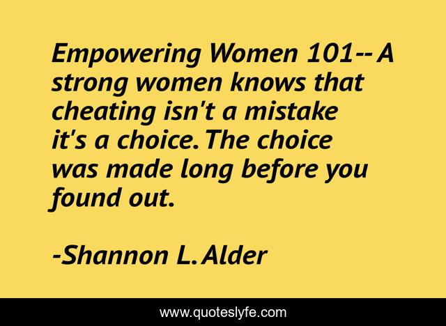 This page presents the quote "Empowering Women 101-- A strong women knows that cheating isn't a mistake it's a choice. The choice was made long before you found out.". Author of this quote is Shannon L. Alder. This quote is about relationships, cheaters, drummers, wives, husbands, players, games, adultery,.