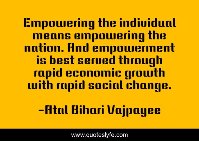 This page presents the quote "Empowering the individual means empowering the nation. And empowerment is best served through rapid economic growth with rapid social change.". Author of this quote is Atal Bihari Vajpayee. This quote is about growth, change, nation,.