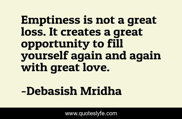 This page presents the quote "Emptiness is not a great loss. It creates a great opportunity to fill yourself again and again with great love.". Author of this quote is Debasish Mridha. This quote is about philosophy, debasish-mridha, quotes, great-love, debasish-mridha-md, inspirational, enthusiasm, emptiness, great-opportunity,.