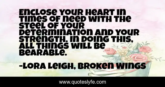 This page presents the quote "Enclose your heart in times of need with the steel of your determination and your strength. In doing this, all things will be bearable.". Author of this quote is Lora Leigh, Broken Wings. This quote is about enthusiasm, life, determination, hardship, inspirational,.