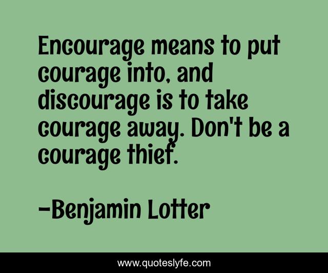 This page presents the quote "Encourage means to put courage into, and discourage is to take courage away. Don't be a courage thief.". Author of this quote is Benjamin Lotter. .
