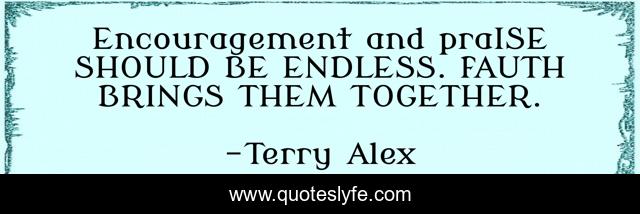 This page presents the quote "Encouragement and praISE SHOULD BE ENDLESS. fAUTH BRINGS THEM TOGETHER.". Author of this quote is Terry Alex. This quote is about faith, encouragement, praise,.