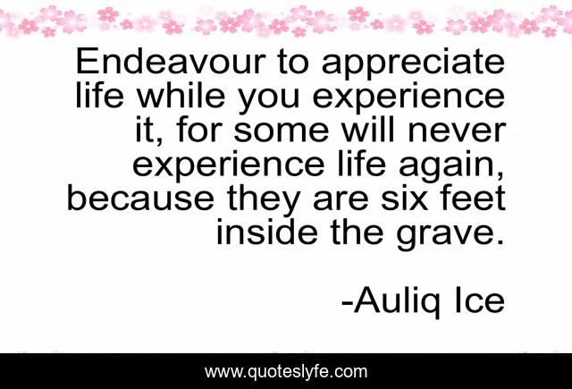 This page presents the quote "Endeavour to appreciate life while you experience it, for some will never experience life again, because they are six feet inside the grave.". Author of this quote is Auliq Ice. This quote is about happiness-in-life, life, survival-of-the-fittest, living-life, self-acceptance, life-and-living, happiness, appreciating-life,.