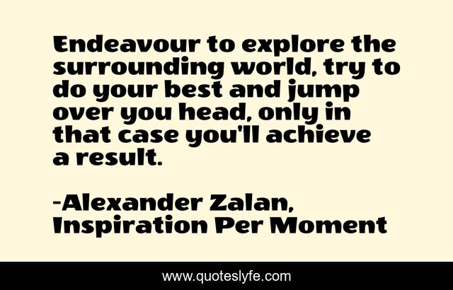 This page presents the quote "Endeavour to explore the surrounding world, try to do your best and jump over you head, only in that case you'll achieve a result.". Author of this quote is Alexander Zalan, Inspiration Per Moment. .