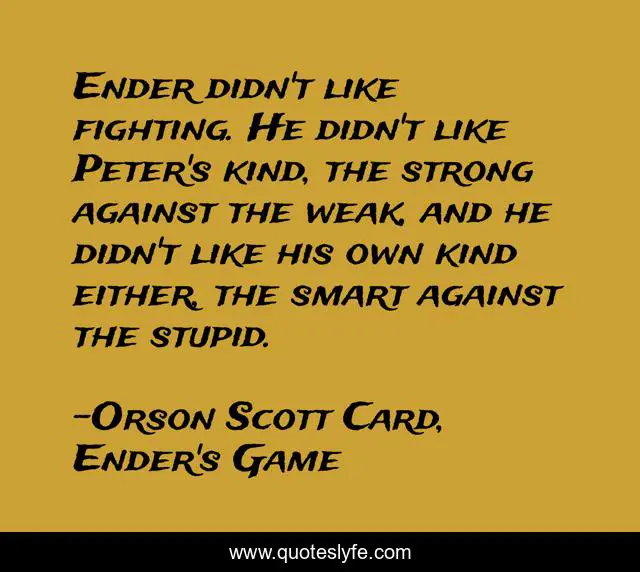 This page presents the quote "Ender didn't like fighting. He didn't like Peter's kind, the strong against the weak, and he didn't like his own kind either, the smart against the stupid.". Author of this quote is Orson Scott Card, Ender's Game. This quote is about force, fighting, manipulation,.