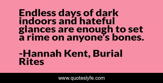 This page presents the quote "Endless days of dark indoors and hateful glances are enough to set a rime on anyone’s bones.". Author of this quote is Hannah Kent, Burial Rites. .