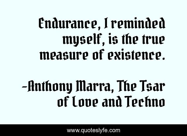 "Anthony Marra, The Tsar of Love and Techno Quotes." Quoteslyfe.com, 2025. Sat. 06 Dec. 2025. <https://www.quoteslyfe.com/quote/Endurance-I-reminded-myself-is-the-true-190647>.