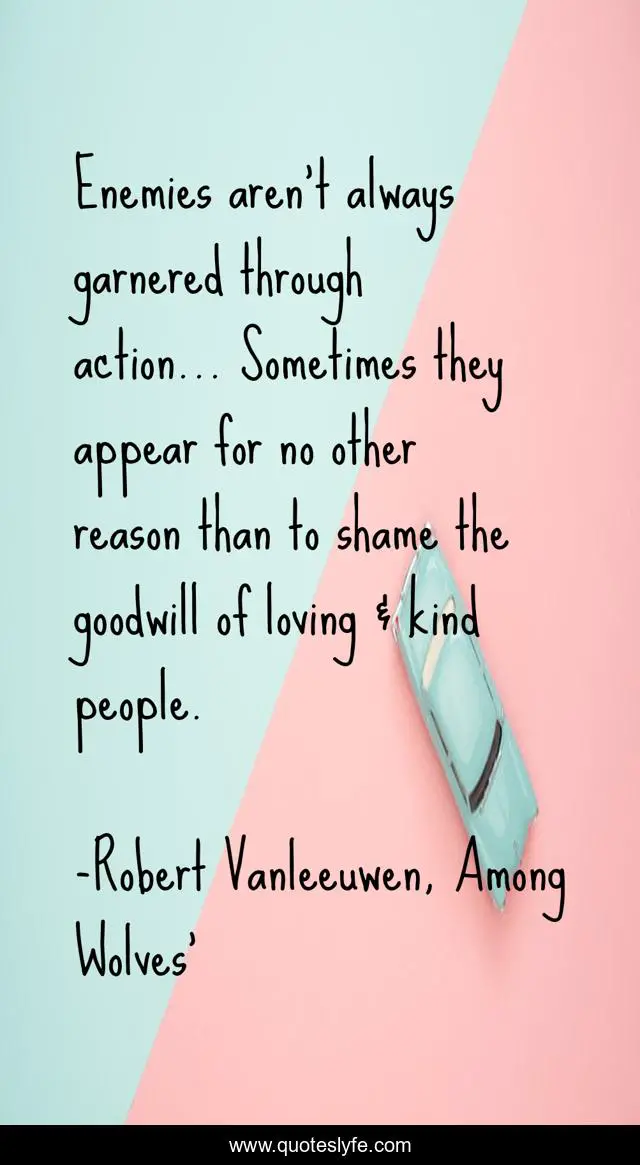 This page presents the quote "Enemies aren't always garnered through action... Sometimes they appear for no other reason than to shame the goodwill of loving & kind people.". Author of this quote is Robert Vanleeuwen, Among Wolves'. This quote is about enemy, humanity, truth,.
