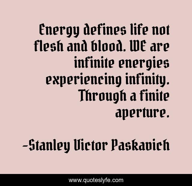 This page presents the quote "Energy defines life not flesh and blood. WE are infinite energies experiencing infinity. Through a finite aperture.". Author of this quote is Stanley Victor Paskavich. .