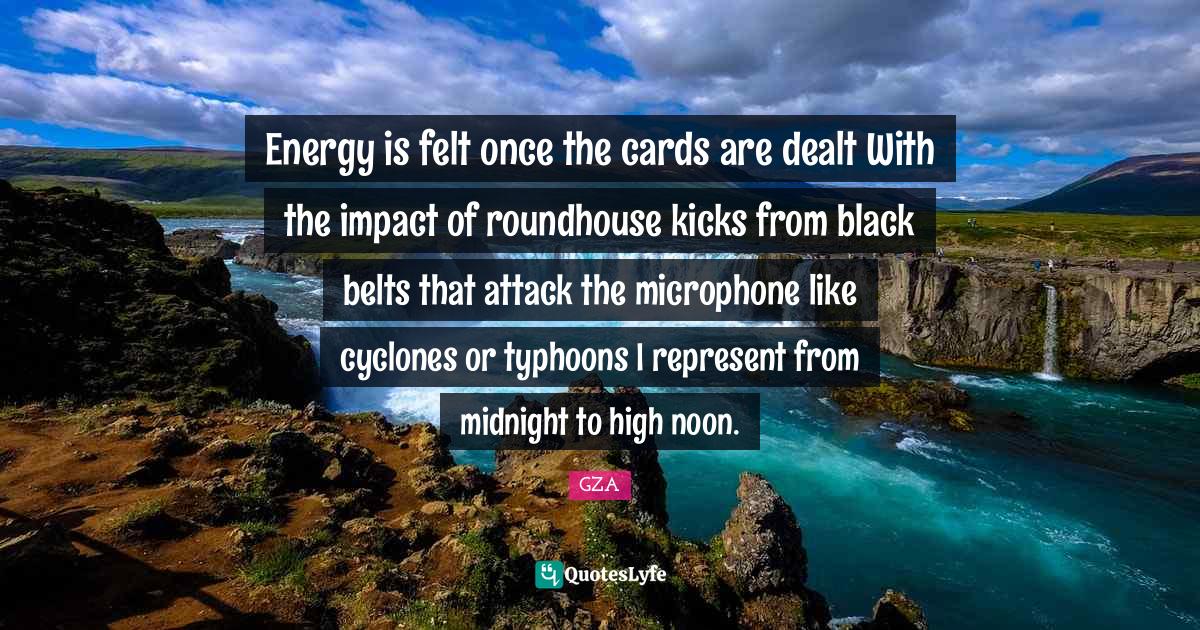 This page presents the quote "Energy is felt once the cards are dealt With the impact of roundhouse kicks from black belts that attack the microphone like cyclones or typhoons I represent from midnight to high noon.". Author of this quote is GZA. This quote is about typhoons, midnight, noon, kicks, black, cyclones, impact, cards, energy,.