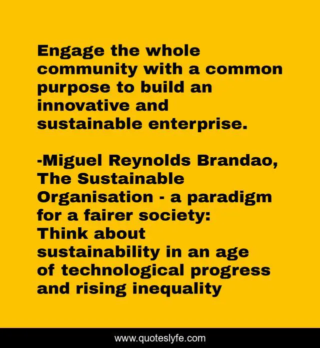 This page presents the quote "Engage the whole community with a common purpose to build an innovative and sustainable enterprise.". Author of this quote is Miguel Reynolds Brandao, The Sustainable Organisation - a paradigm for a fairer society: Think about sustainability in an age of technological progress and rising inequality. This quote is about development, sustainability, leadership, economy,.