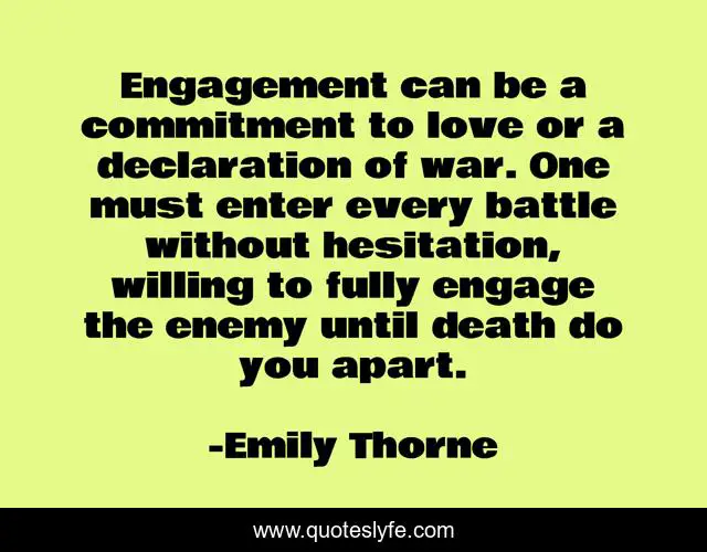 This page presents the quote "Engagement can be a commitment to love or a declaration of war. One must enter every battle without hesitation, willing to fully engage the enemy until death do you apart.". Author of this quote is Emily Thorne. This quote is about revenge-tv-series, enemy, death, love, engagement, commitment, revenge, declaration, battle,.