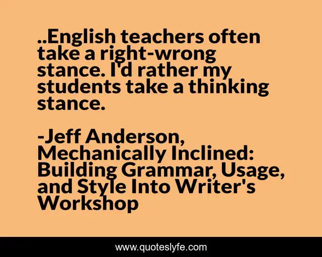 "Jeff Anderson, Mechanically Inclined: Building Grammar, Usage, and Style Into Writer's Workshop Quotes." Quoteslyfe.com, 2025. Fri. 05 Dec. 2025. <https://www.quoteslyfe.com/quote/English-teachers-often-take-a-right-wrong-198771>.