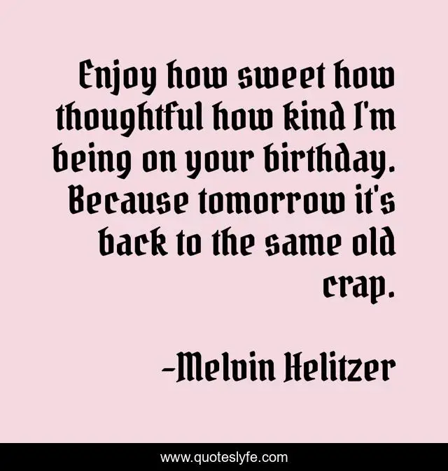 This page presents the quote "Enjoy how sweet how thoughtful how kind I'm being on your birthday. Because tomorrow it's back to the same old crap.". Author of this quote is Melvin Helitzer. This quote is about age, birthdays,.