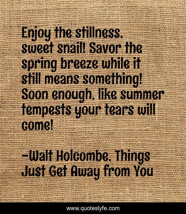 This page presents the quote "Enjoy the stillness, sweet snail! Savor the spring breeze while it still means something! Soon enough, like summer tempests your tears will come!". Author of this quote is Walt Holcombe, Things Just Get Away from You. This quote is about enjoy, summer, spring, stillness, tears, meaning,.