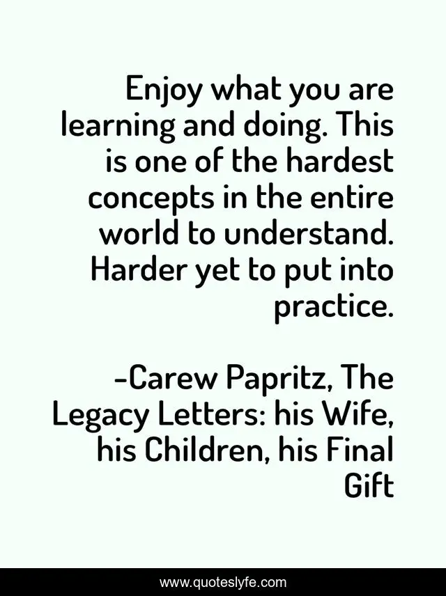 This page presents the quote "Enjoy what you are learning and doing. This is one of the hardest concepts in the entire world to understand. Harder yet to put into practice.". Author of this quote is Carew Papritz, The Legacy Letters: his Wife, his Children, his Final Gift. This quote is about enjoy, book-qoute, read, quote, practice, live-life-so-well, life, quote-by-carew-papritz, quotes,.