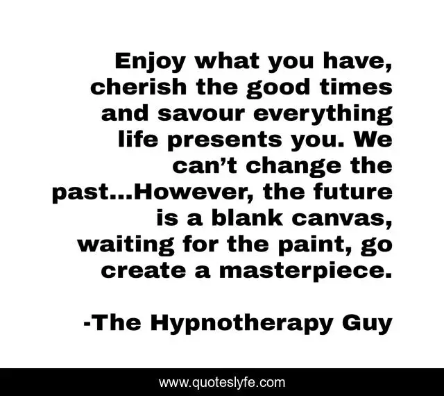 This page presents the quote "Enjoy what you have, cherish the good times and savour everything life presents you. We can’t change the past…However, the future is a blank canvas, waiting for the paint, go create a masterpiece.". Author of this quote is The Hypnotherapy Guy. This quote is about inspirational-attitude, enthusiasm, future, inspirational,.