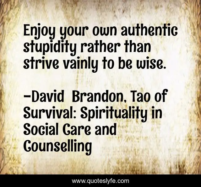 This page presents the quote "Enjoy your own authentic stupidity rather than strive vainly to be wise.". Author of this quote is David Brandon, Tao of Survival: Spirituality in Social Care and Counselling. This quote is about naturalness, authenticity,.