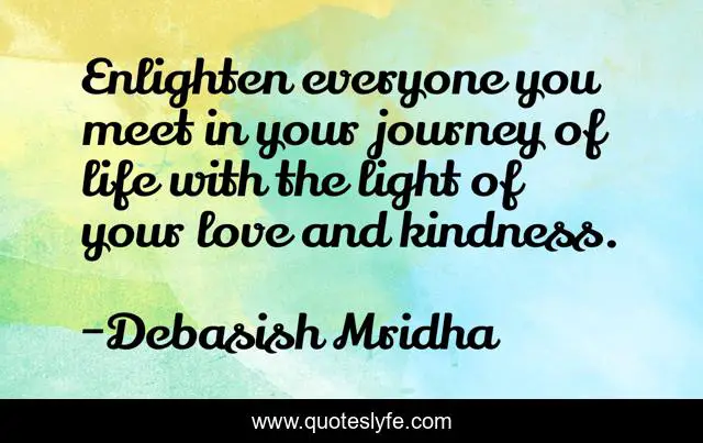This page presents the quote "Enlighten everyone you meet in your journey of life with the light of your love and kindness.". Author of this quote is Debasish Mridha. This quote is about debasish, love, light-of-your-love, everyone-you-meet, mridha, light-of-love, philosophy, debasish-mridha, journey-of-life,.
