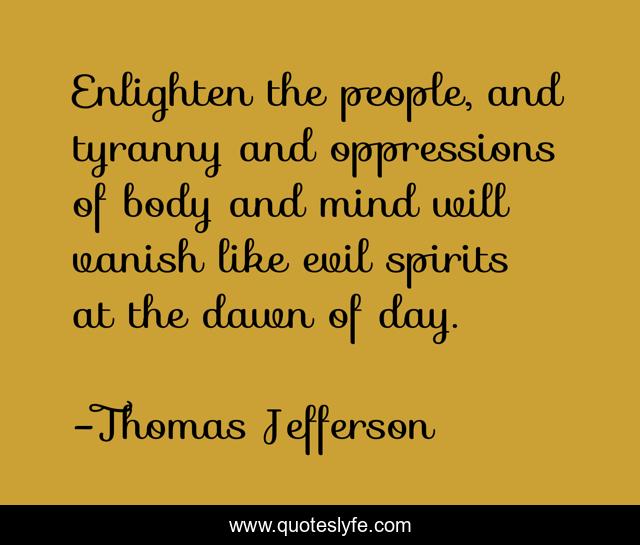 This page presents the quote "Enlighten the people, and tyranny and oppressions of body and mind will vanish like evil spirits at the dawn of day.". Author of this quote is Thomas Jefferson. .